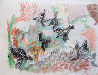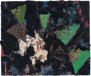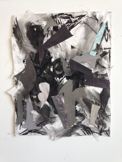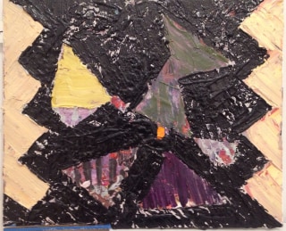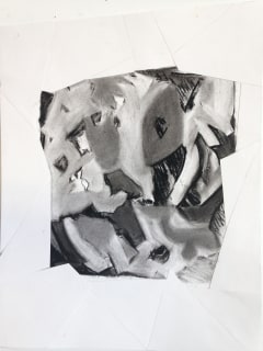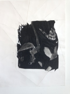 Bonner revisits specific memories repeatedly, shifting media from collage to drawing and oil painting. The formal composition of these memories reconfigure as Bonner’s memories deepen or renew with contemplation. Many of the works in the exhibition were inspired by Tim Winton’s collection of short stories The Turning. A weaving narrative set in Australia, the stories dwell on adolescent exploration, drugs, religion, the adult effects of childhood abuse, and the spiritual and restorative capacity of nature. The novel conjured many of Bonner’s own overlapping childhood memories in Australia, the child of alcoholic, strictly Catholic parents and the incumbent need for rebellion. In The Bridge boys lie under a bridge, as trucks rumble overhead. Sharp, geometric lines embody the cacophonous and exhilarating sounds of the trucks overhead, and suggest the youthful desire for proximity to danger. In Bonfire, a night scene rendered with dramatic chiaroscuro, the lashing bright flames of the bonfire are surrounded by the revelry of a group of friends, exploring and seeking their own limitations.