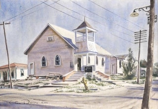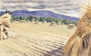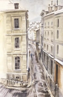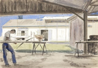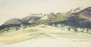 After a lengthy trip to Germany with his sister where he drew and observed the rise of the Nazi party, Dows returned to Rhinebeck and painted the two post offices in the period before Pearl Harbor. In 1941-2 he again worked in the Treasury and Office of Civilian Defense. He joined the Army as a technical private and was promoted to Technical Sargent by D-Day. Dows was asked to serve as one of three offical war artists assigned to the European Theatre of Operations. He was in active combat in St. Lo, the Bastogne, Torgan and the Ruhr Valley campaign in 1945.
