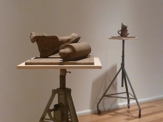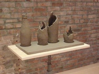 The static objects belie the emotions which inspired them…The monochrome color and the dry texture of the clay remind me of the desert and objects buried, then excavated.  Because clay is an ancient material, this work could have come from a remote past. Because these pieces originated in my experience, the work represents the archaeology of my past.  Because clay has this quality of timelessness, the represented actions of violence and rage can be imagined now or in the future.