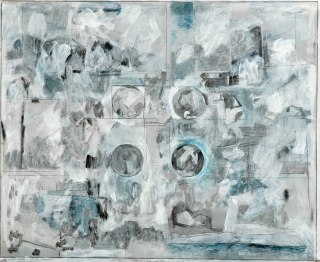 Piazzolla in Traffic combines two ideas. Piazzolla of the title references Ástor Piazzolla, a radical Argentine composer positioned between classical and secular pop aesthetics. Traffic is the title of one of Zapkus’s own painting from 1975, which was a radical and innovative work for his career. Traffic consisted of a quartet of four abrasively oblique panels, which attempted to find resolution into classical aesthetic balance. In musical architecture – measure to measure, forward and back, theme and variation - builds a whole. Piazzolla in Traffic is likewise constructed of small units making a whole as a sum of the parts. The experience is an inclusive summation of these particular references, discordant yet co-dependent. The four panels quoted from Traffic, 1975 are joined with spinning individual configurations (as if tango couples dancing) in a modulated, pulsating, gray arena. The work is an ambitious summary of Zapkus’s painterly evolution.