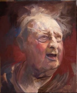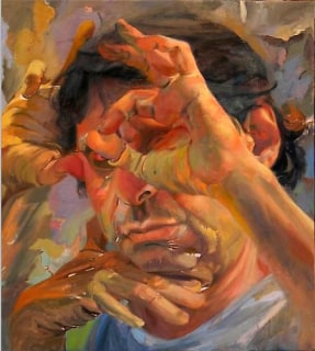 In Davis’s work as in Vermeer’s, the space of the picture as a whole is as obdurately inward as the figure within it. The inwardness suggests depth, but at the same time, like the peculiar detachment of the artist’s forming hand from his expressive face, it signals the disjunction of this space from ours. And being, unlike Vermeer, a late modern, Davis associates the break from the illusion of depth with painterly abstraction’s stress on the picture plane. “I search,” he says, "for a way to give my subjects a space that feels like I’ve liberated them from three-dimensional restraints and gained for them a freedom that can only exist in a two-dimensional world. Searching for a way to achieve this ambiguous place is a big part of my struggle to resolve a piece."