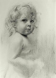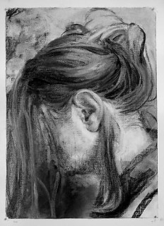 Davis’s media of choice are oil and charcoal—soft media, malleable, carrying the implication that the image might go on changing, remain forever unfinished, or at least retain, as Davis says, “the loose boundaries of a study.” Hence, perhaps, his recent preference for drawing over painting. And yet, there is nothing sketchy about the drawings; like the paintings, they have a high, almost excruciatingly high, degree of finish. The skin-rough surface of canvas or paper is touched, and touched, and touched again, with a hand that is no less nervous for being exceptionally expert. A hand—but whose hand?