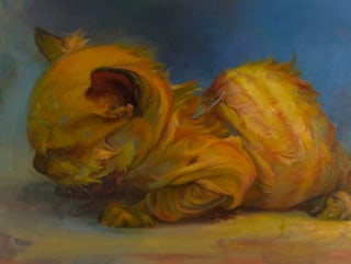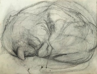 The chief danger he runs on the way is falling into sentimentality. And, given that, what more dangerous model could he choose than the cat, always a sticky subject, and now the universal meme for the pornography of the emotions? The lol-cats, though, like all pornographic models, are pure projections: the emotions they conjure are the viewer’s alone. Davis’s cats, by contrast, possess subjectivity, but of a kind that must remain inaccessible to us. Rolling, grooming, or crouching with the same intense concentration that Davis brings to the touch and touch and touch of the crayon, they are absorptive figures, like Vermeer’s women, only more perfectly sealed-off.