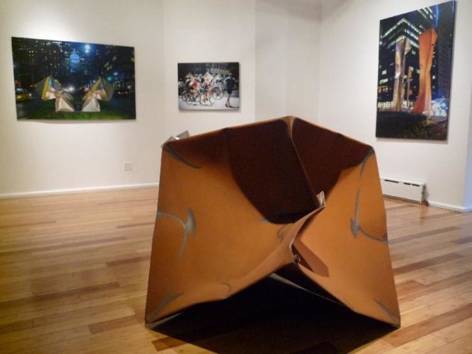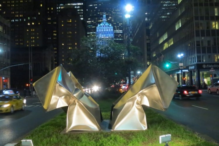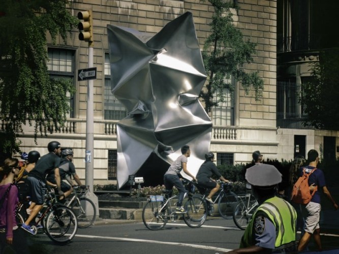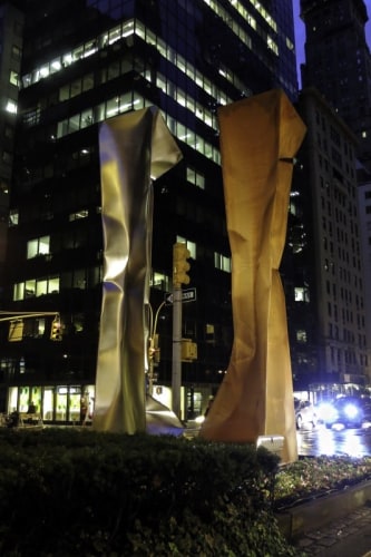 The exhibition will also feature several large scale photographs of the Park Avenue sculptures printed on metallized paper by German artist Clara von Aich. The photographs capture the sculptures relationship to their setting - reflecting the nocturnal lights of the city, surrounded by bicyclists, or glinting with the silhouettes of nearby buildings.