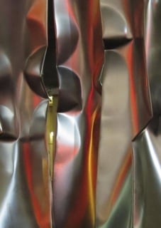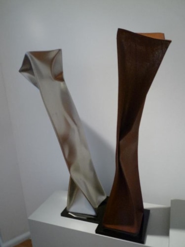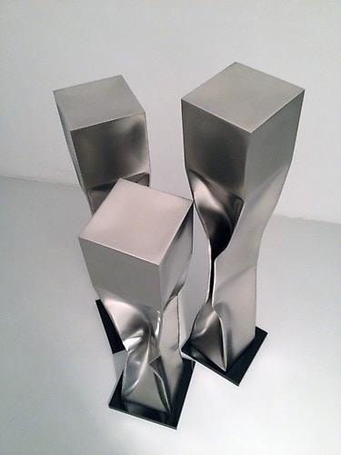 The forms are welded and often polished to satin gloss. Using a vacuum pump, Hilgemann then draws air out of the steel forms, creating an internal atmospheric pressure that collapses the steel into lyrical, dancing shapes. The resulting sculptures are a combination of planning and chance, possessing unique and unexpected qualities, which renders steel as a surprisingly delicate medium.