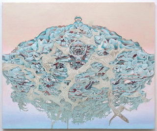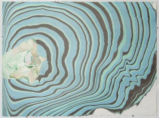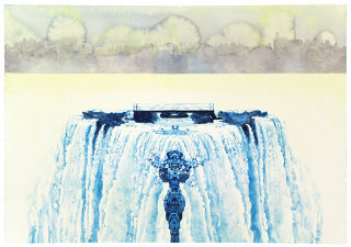 The watercolors, some wonderfully intimate, depict physically impossible places: remote islands surrounded by waterfalls and small planets where water flows both up and down. Using techniques that marble the actual paper with liquid ink baths, and layer on top of that watercolors and graphite that do not tolerate errors; these are masterworks of art on paper as well as beautiful studies in color and perspective. The imaginary landmasses and waterfalls signify constructed realms of safety. The implausibility of these spaces suggests the impossibility of complete security. These spaces are the artist's own defined interpretations of ‘place’: such as heaven or home.