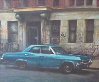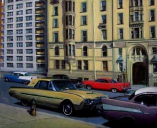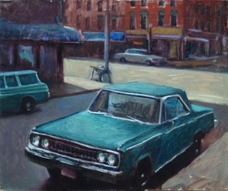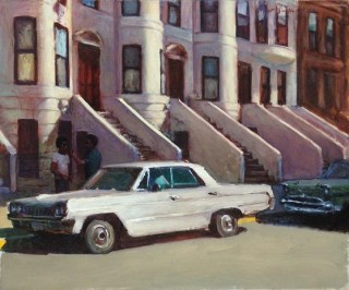 The exhibition places Seyffert’s most recent New York cityscapes and automobile paintings in dialogue with his earlier works from the 1990s and his first explorations of these subjects in late 1980s while he was teaching in Baltimore. Seyffert’s works in this exhibition depict mid-to-late 20th century cars within both real and imagined urban landscapes. Vehicles that defined the changing desires of the American dream, from a 57 Chevy to a Pontiac Delta 88, are painted with the intention of inciting memory and nostalgia. Yet, the detached and almost voyeuristic aesthetic of each of Seyffert’s scenes renders the works even more compelling. The virtuosic use of oil paint excites the viewer’s sense of beauty; “Whether it’s a big tree or a 1965 Pontiac,” Seyffert said, “there’s something about the light hitting the subject that excites me, and that’s what I paint. . . I’m trying to get the sensation created by the thing I’m looking at, and not just copying it” (Howell, 2003).