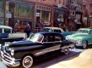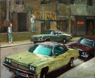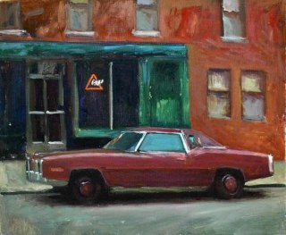 As these classic cars vanish from the urban landscape and are relegated to the domain of car shows, Seyffert’s Urban Automobiles are reminders of an age of American industrial prowess set within a gritty urbanity that has increasingly given way to gentrification. A keen sense of observation enhances each work as the viewer delights in the details of chrome and glass, while also identifying the characters painted within; the scenes sometimes include portraits of art historical figures peripherally located to the cars. Figures such as Tanager Gallery regulars Sam Goodman and Willem de Kooning stand as observers within Seyffert’s vignettes.