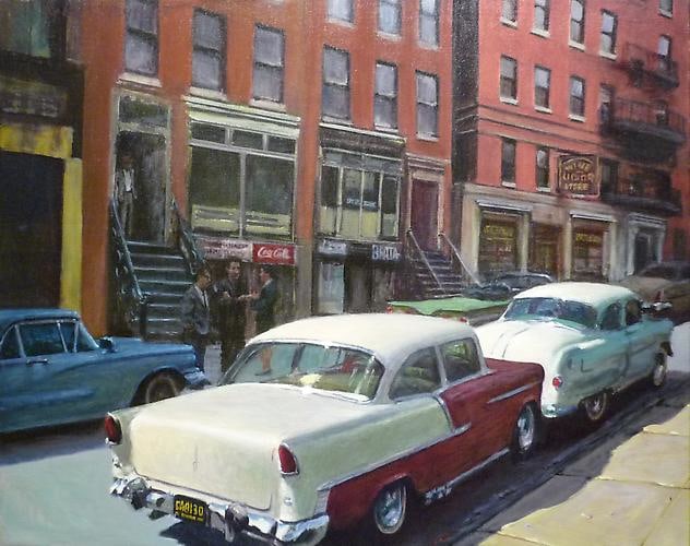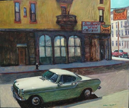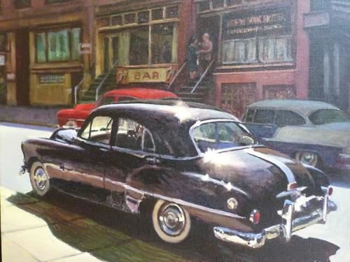 As these classic cars vanish from the urban landscape and are relegated to the domain of car shows, Seyffert’s Urban Automobiles are reminders of an age of American industrial prowess set within a gritty urbanity that has increasingly given way to gentrification. A keen sense of observation enhances each work as the viewer delights in the details of chrome and glass, while also identifying the characters painted within; the scenes sometimes include portraits of art historical figures peripherally located to the cars. Figures such as Tanager Gallery regulars Sam Goodman and Willem de Kooning stand as observers within Seyffert’s vignettes.