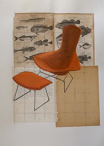 Chair with Fish, 2013, Acrylic with collage on paper, 30 x 22 inches