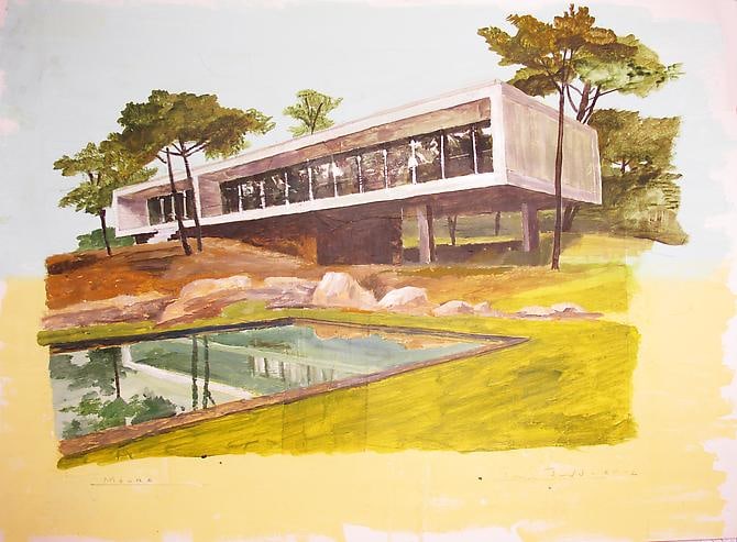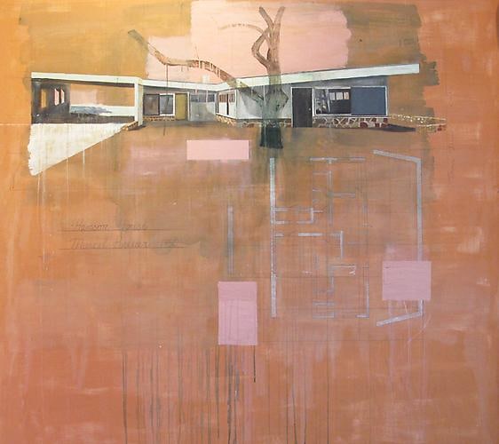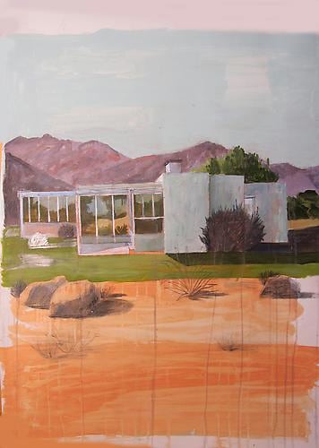 Judd has prepared an exhibition of monumental canvases and drawings about the relationship between the modern architecture of his childhood and their fading isolation and their ultimate archaic decline and isolation as they enter history. The allegory begins with Judd’s own family “modern” pink house built in the hills near Salt Lake City and is expanded in seven other paintings of 20th Century houses by Breuer, Mies van der Rohe, Neutra and others, floating in unstable spaces, empty and alone, as isolated as a Hopper streetscape. While the modern house is conceived as a monumental and functional trophy of the new, it is also a symbol of the lonely and isolated passages of modern life. Tom Judd commented that: “I grew up in the 60s in a pink cinder block house with large windows, a patio with a rock garden and open carport. Although influenced by the ideas of early modern architecture, the house had none of the attention to detail and great design. Yet for its time it was a bold statement and embraced exotic ideas about the future. My parents built the house in 1958. I remember a picture of my father in 1957 standing in an empty field with the architectural drawings under his arm, anticipating the ground breaking and imagining himself living in a ‘Modern House’. But something always happens to our ideas about the future when that future finally arrives.”