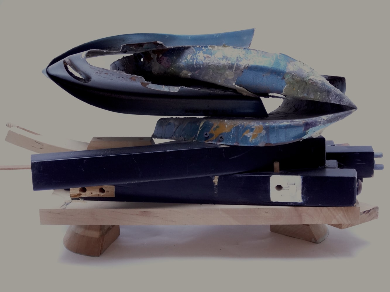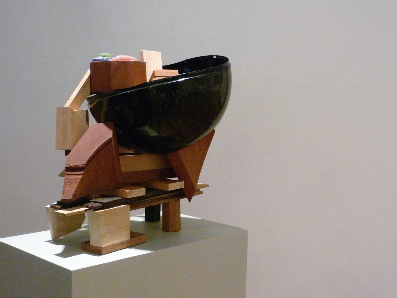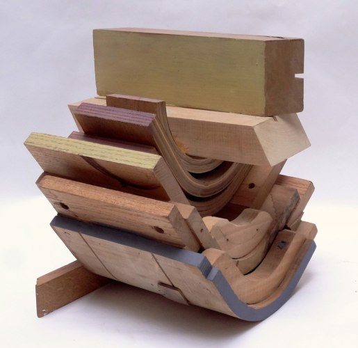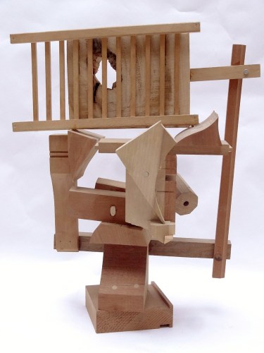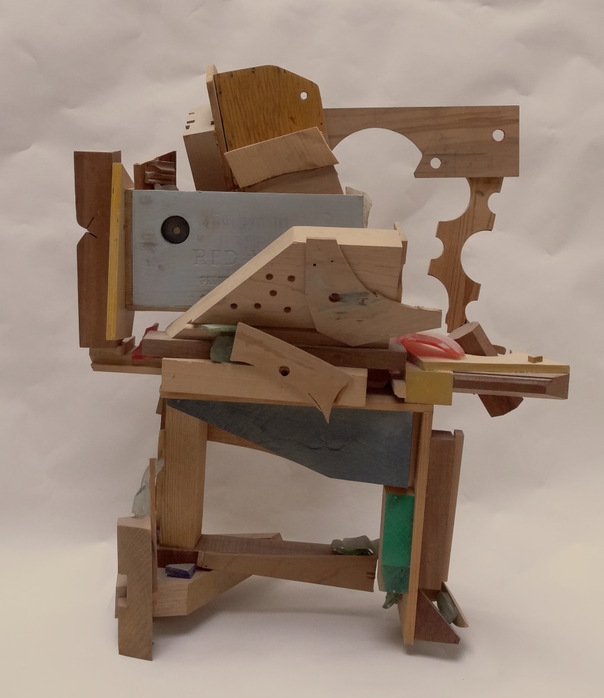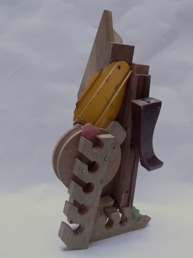 Sound and rhythm also play a role in American artist Paula De Luccia’s sculptures, which from all vantage points are filled with mass and recess, tension and release. Constructed from physical detritus, old crates, pieces of plastic, chips of Murano glass, De Luccia configures whimsical, elaborate sculptures, often taking anthropomorphic forms, as with Mill Wild, in which the body of glass and painted wood stands on slender legs and feet.